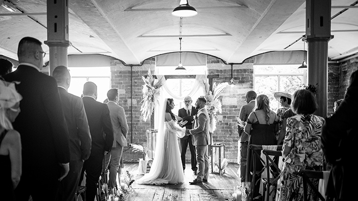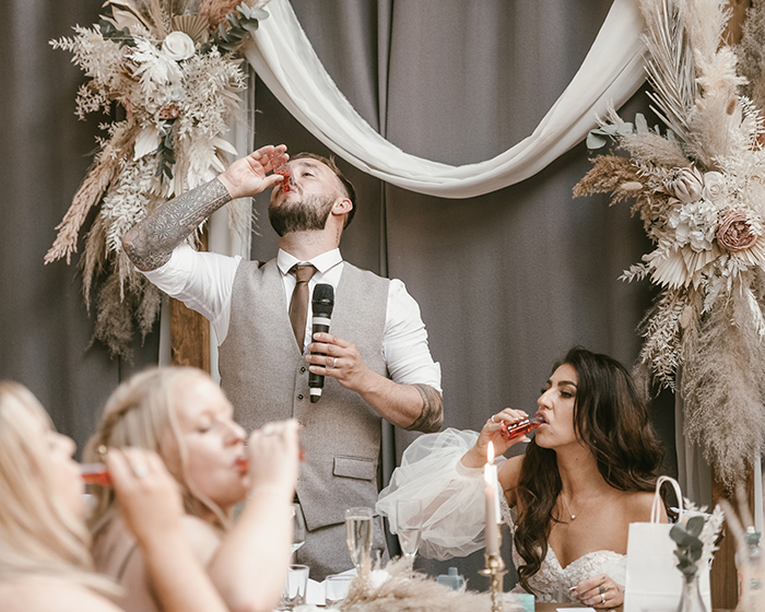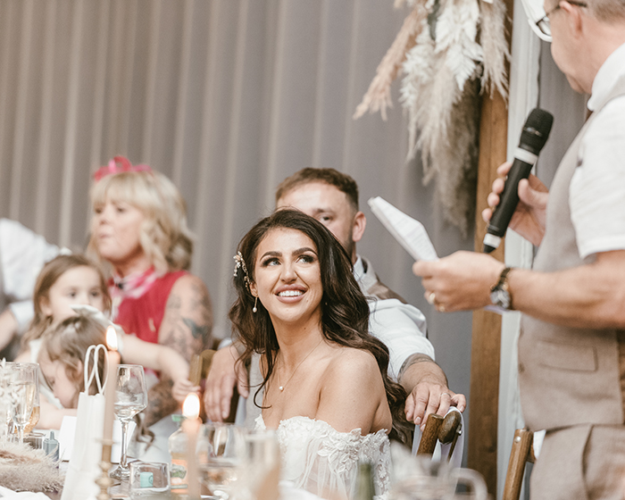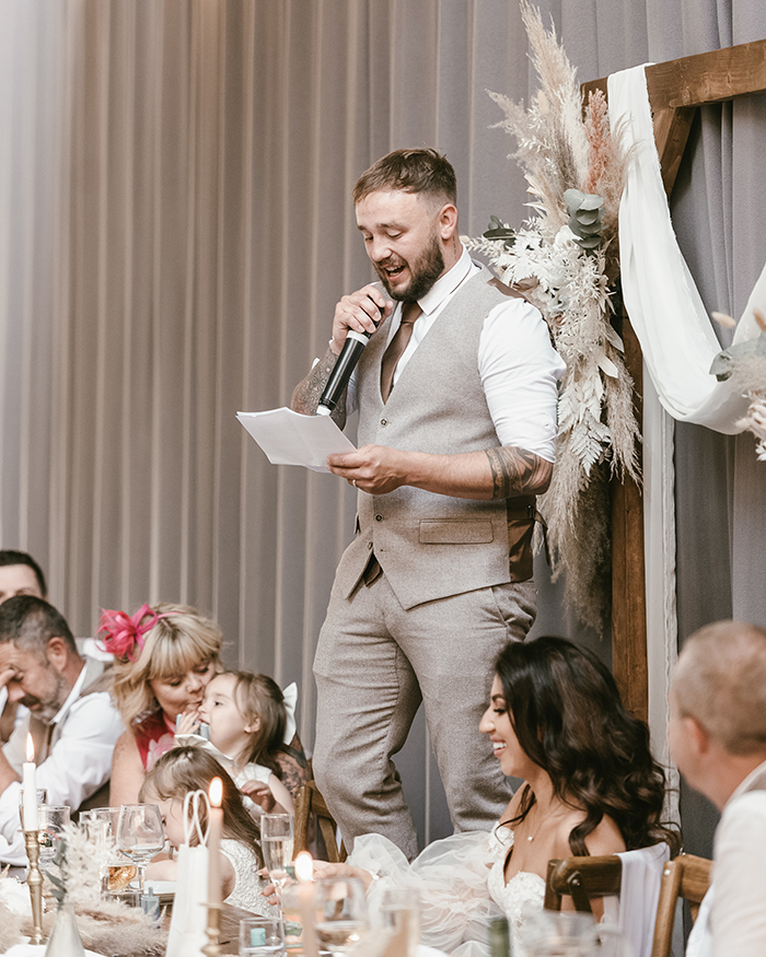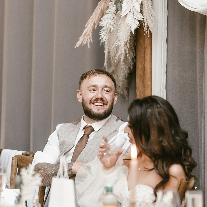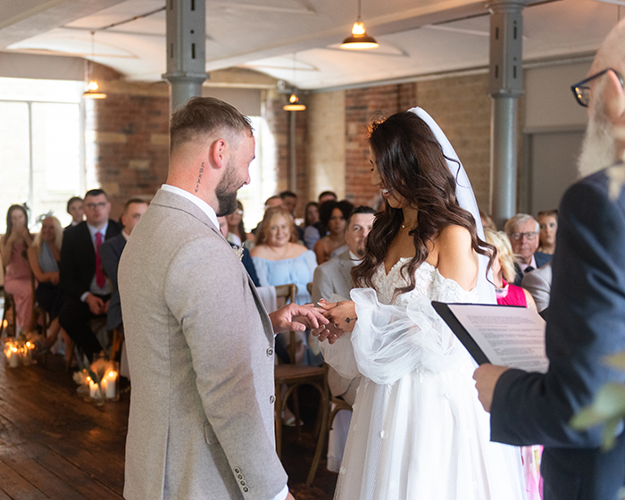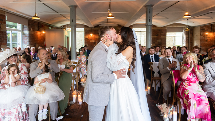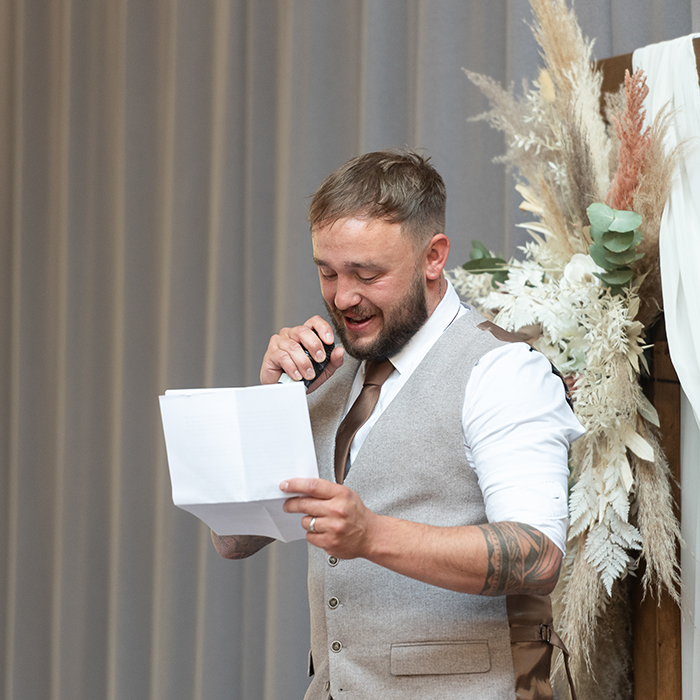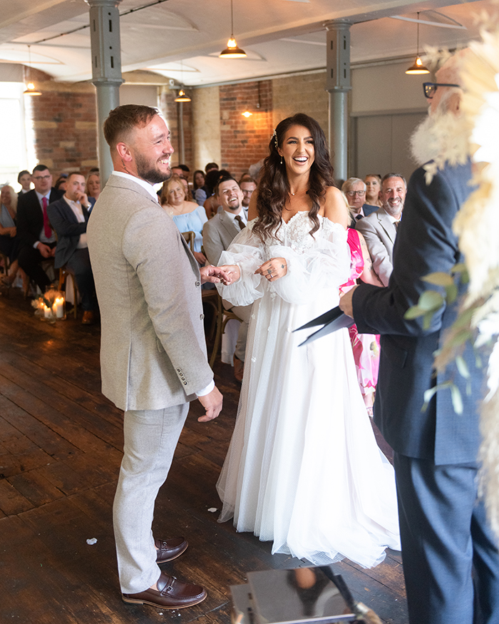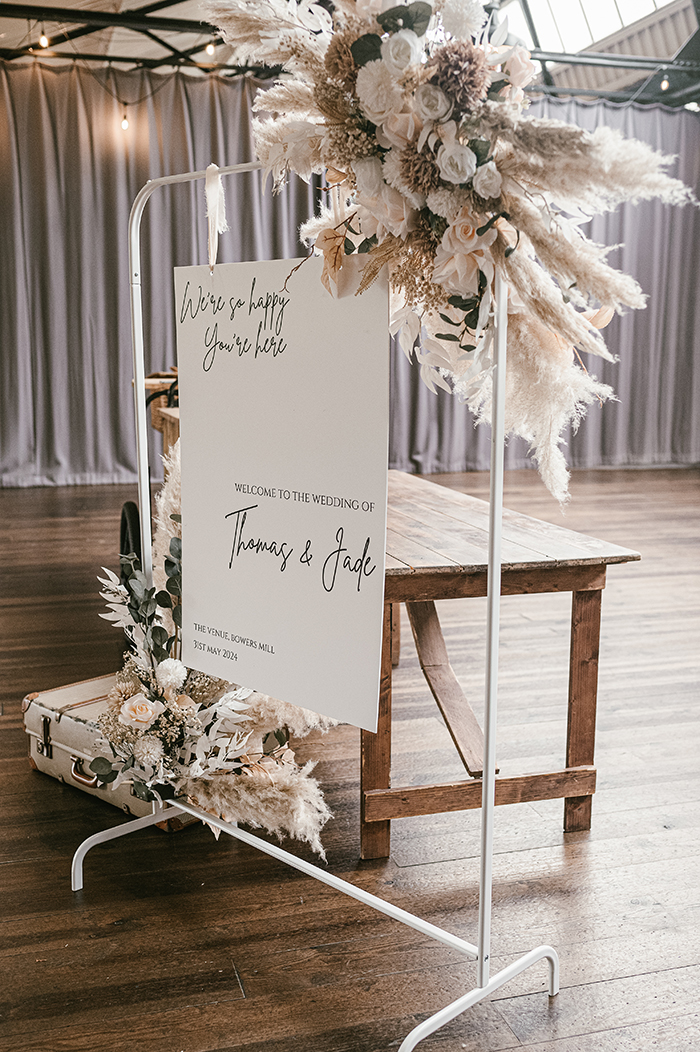 The ceremony took place inside Bowers Mill’s beautiful indoor space. Jade looked incredible in her gown, and you could see how excited Tom was the moment she walked in. Their vows were heartfelt and personal, and the whole room felt warm and full of emotion as they said “I do.”